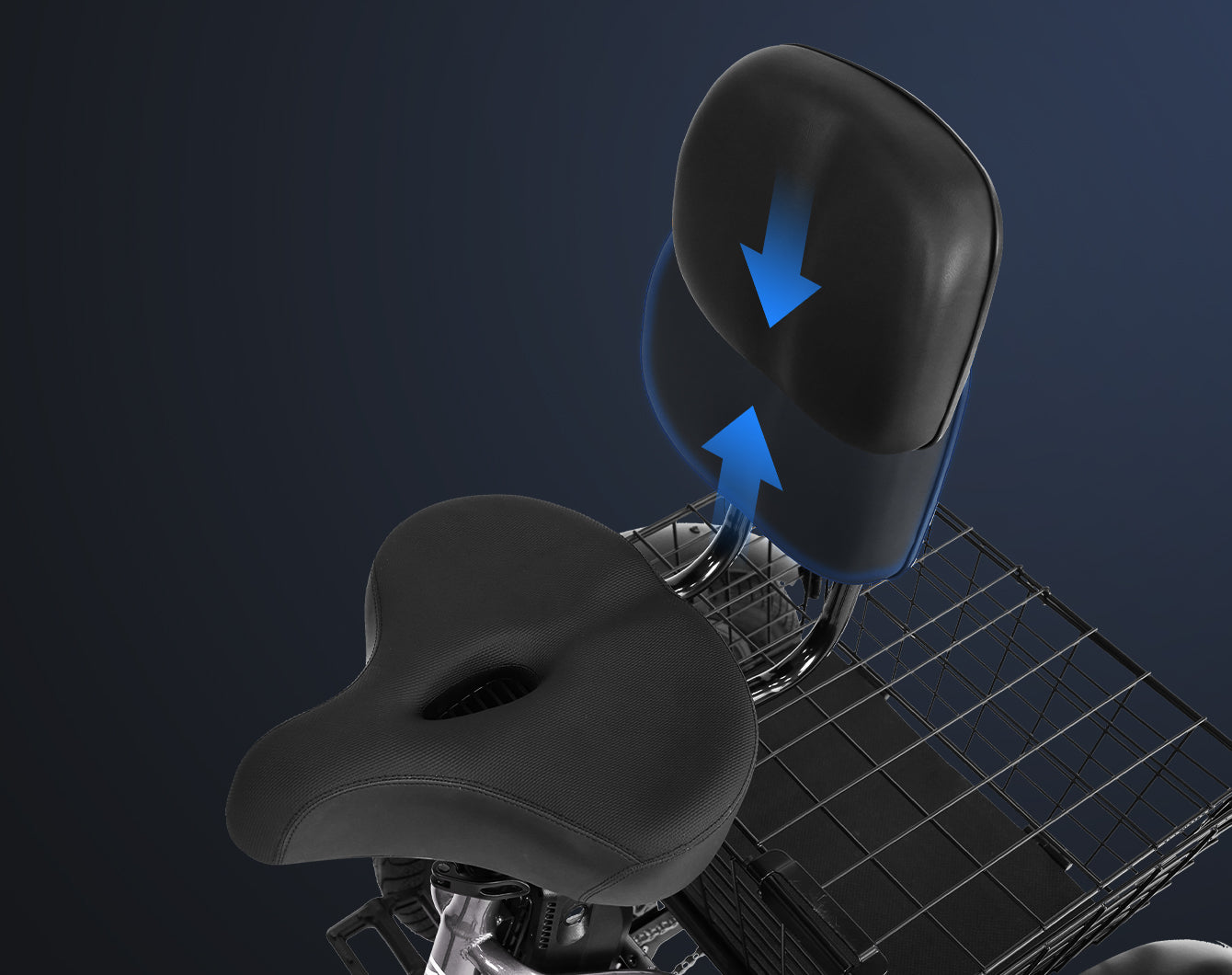 The Eskute Electric Trike isn’t just stable—it’s built for all-day ease. Enjoy a 300mm cloud-soft saddle, and a low 345mm step-through frame for effortless mounting. Plus, the secure parking brake keeps you steady whenever you stop.