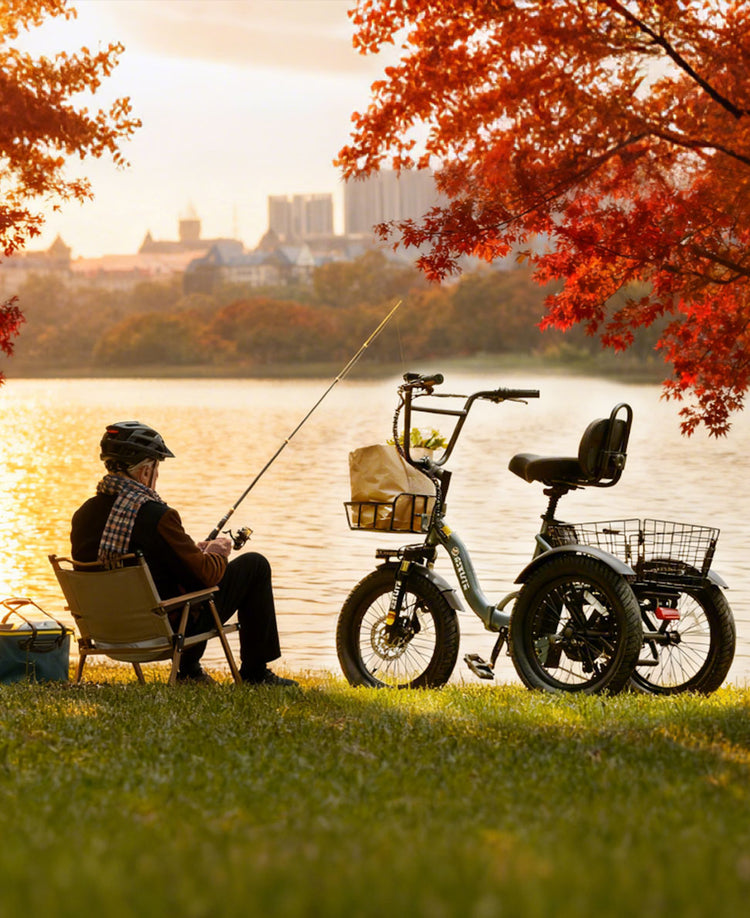 This sturdy electric tricycle carries 400lbs of gear with its spacious front basket (perfect for rods) and large rear cargo area (fits 48qt coolers). The low-step frame and stable 3-wheel design ensure easy, comfortable rides to your fishing spot, with electric assist for hills.